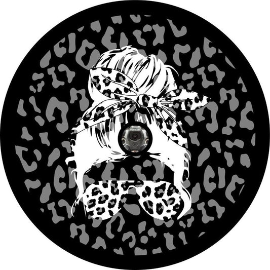 Leopard Print Spare Tire Cover With Top Knot Girl Silhouette Design