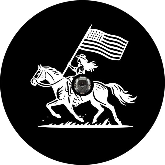 Cowgirl on a Bronco with American Flag Spare Tire Cover for Jeep, Bronco, RV, Camper, Trailer, & More