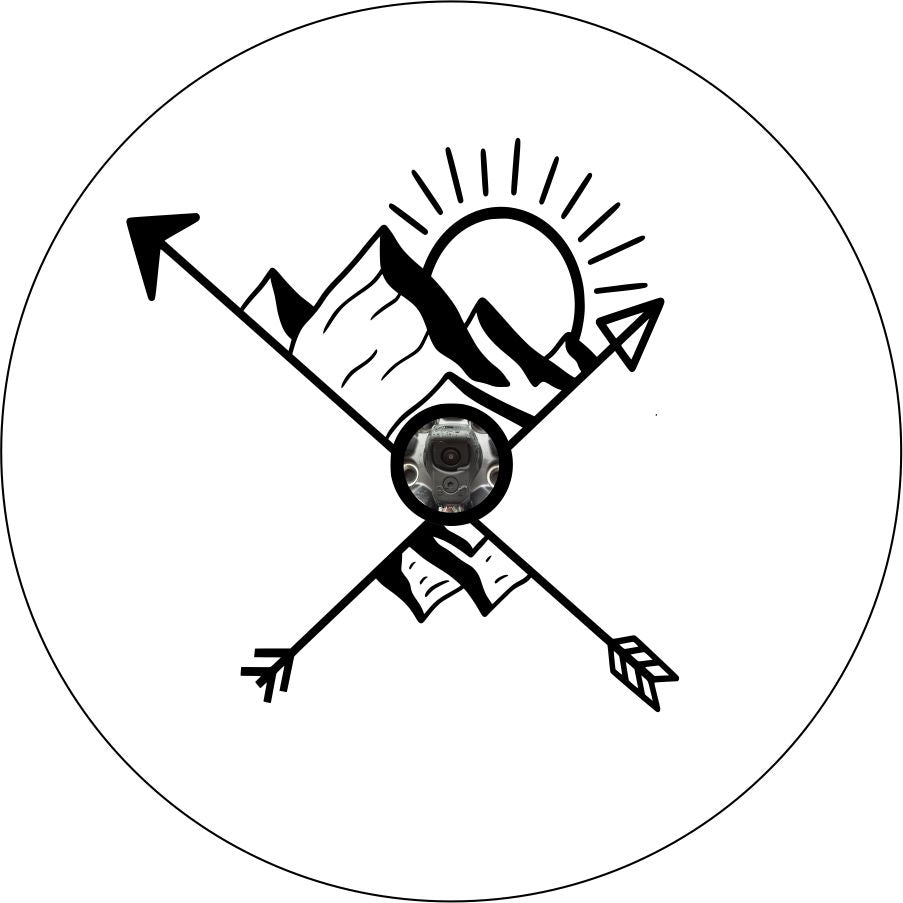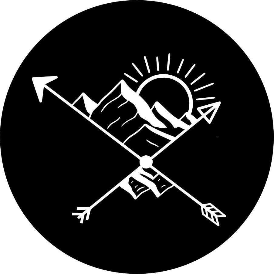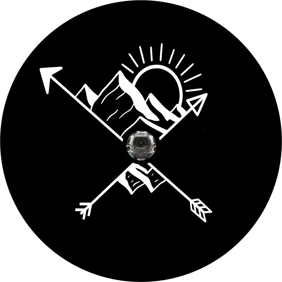 We love this creative design with two arrows crossing each other and a silhouette image of mountains with a sun rising or setting over them. There is also a small reflection of the mountains on the bottom of the arrows intersection. This spare tire cover design is a high-quality custom-fit cover for any vehicle, make, model, and size - Jeep, RV, Travel Trailer, Camper, and more!