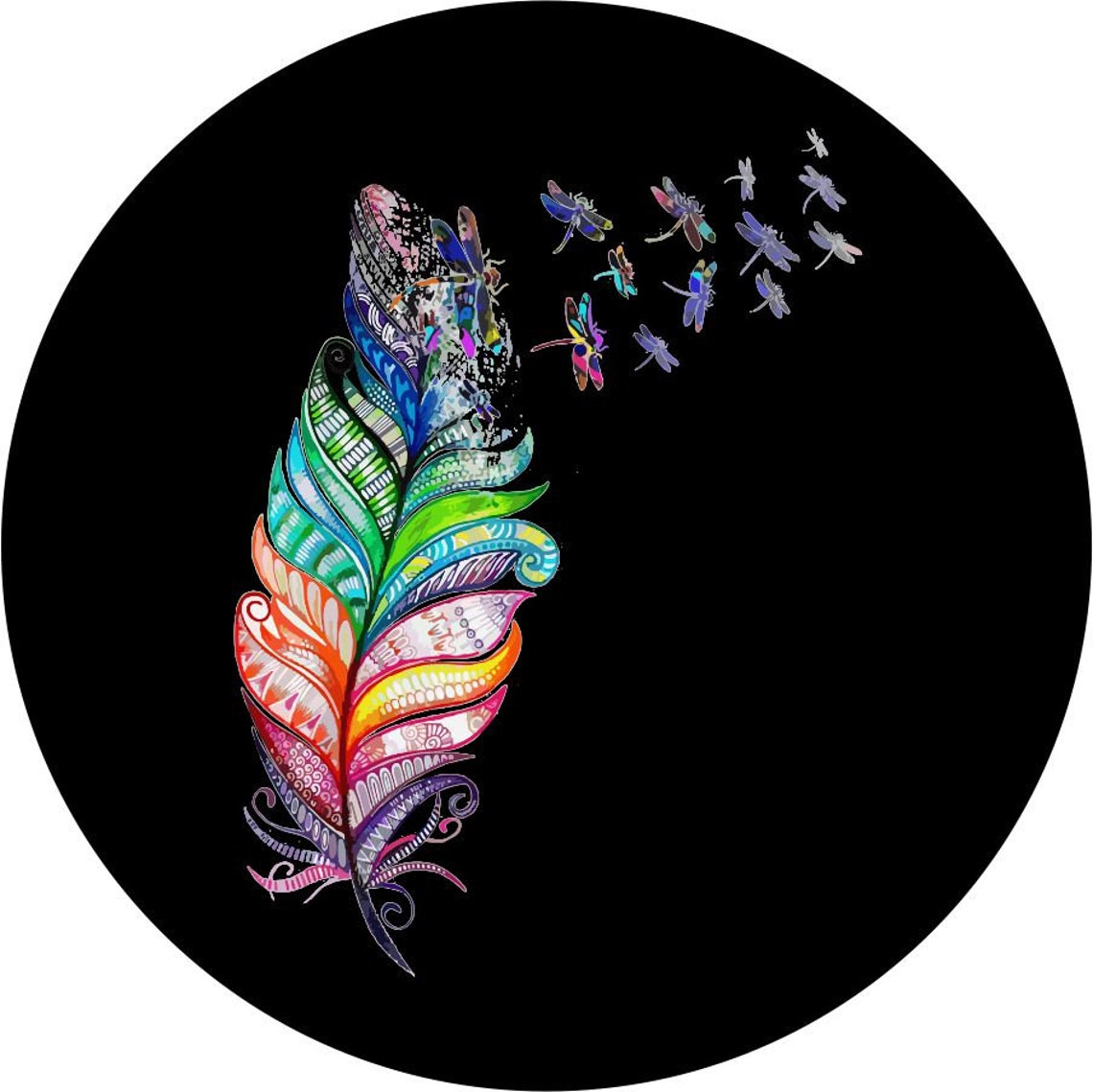 A colorful and artistically designed feather that's disintegrating into dragonflies flying off.