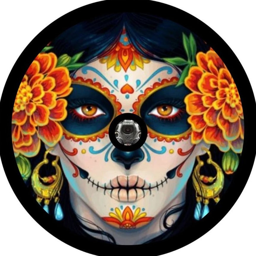 Spare tire cover of a woman's face inspired by the Día de los Muertos or day of the dead celebration. Hand painted Mexican influenced designed sugar skull face framed by bright orange marigold flowers in the traditional look of the day of the dead designs.
