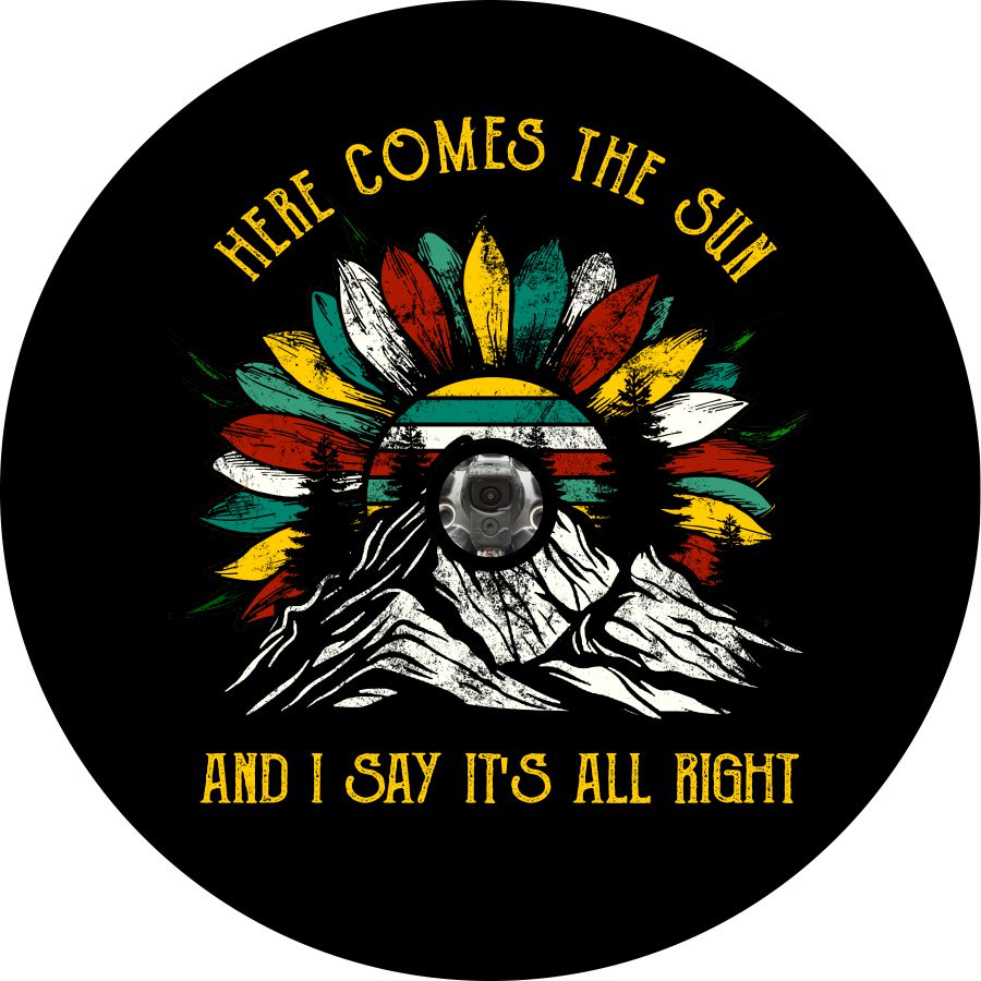 From the classic Beatles song, Here Comes The Sun, the song lyric, "Here Comes the Sun And I Say It's Alright" scripted around a beautiful image of a native colored sunflower design behind the mountains. This spare tire cover design is a high-quality custom-fit cover for any vehicle, make, model, and size - Jeep, RV, Travel Trailer, Camper, and more!