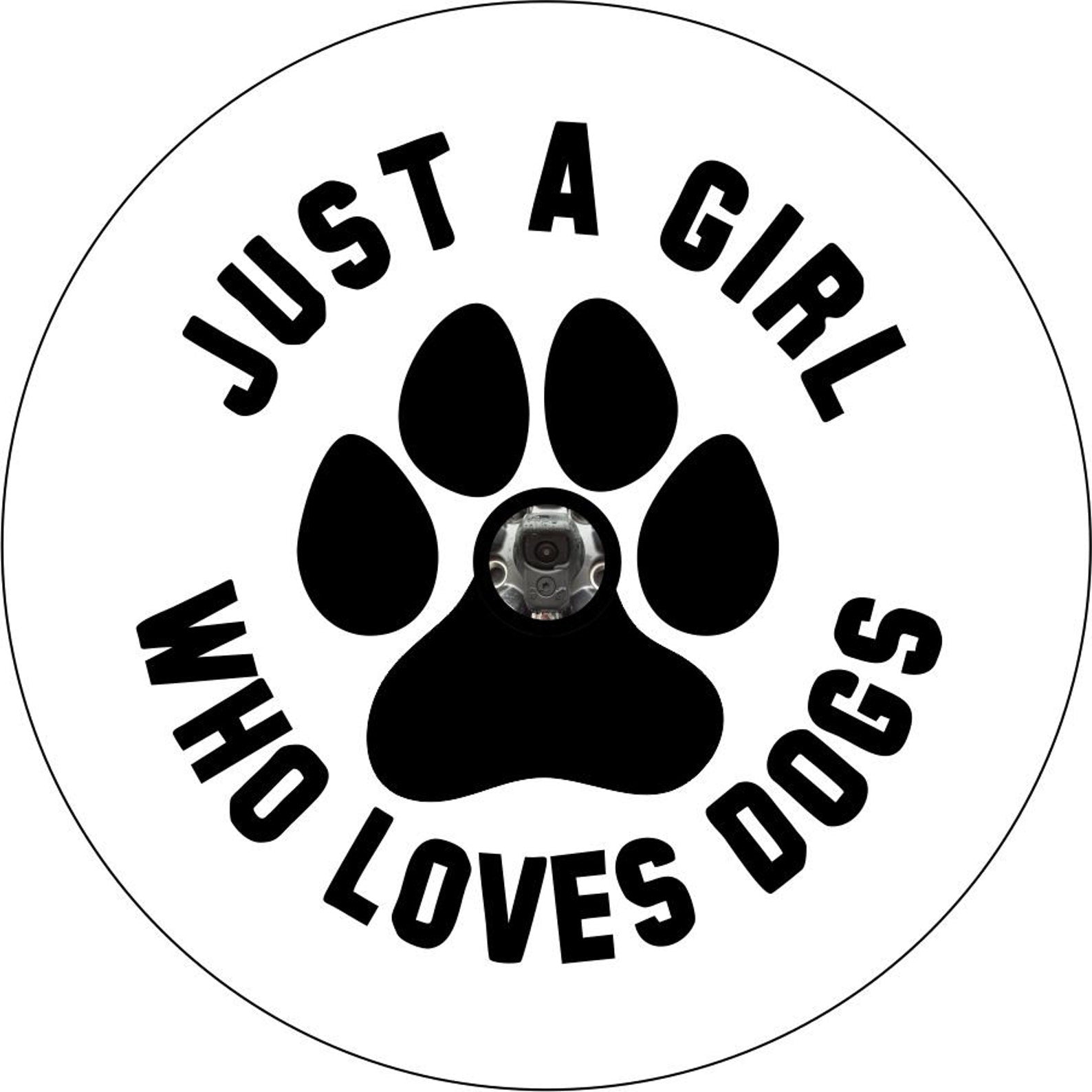 A large paw print with the saying on the edges, "Just a girl who loves dogs." This spare tire cover design is a high-quality custom-fit cover for any vehicle, make, model, and size - Jeep, RV, Travel Trailer, Camper, and more!