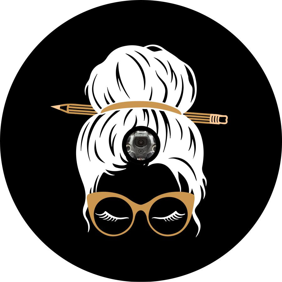 A silhouette of a lady with a messy bun and a pencil going through the topknot wearing trendy glasses. An image symbolizing a teacher, but if this image resonates with you, it's a cute style, go with it!