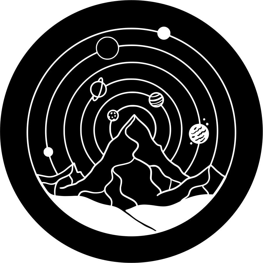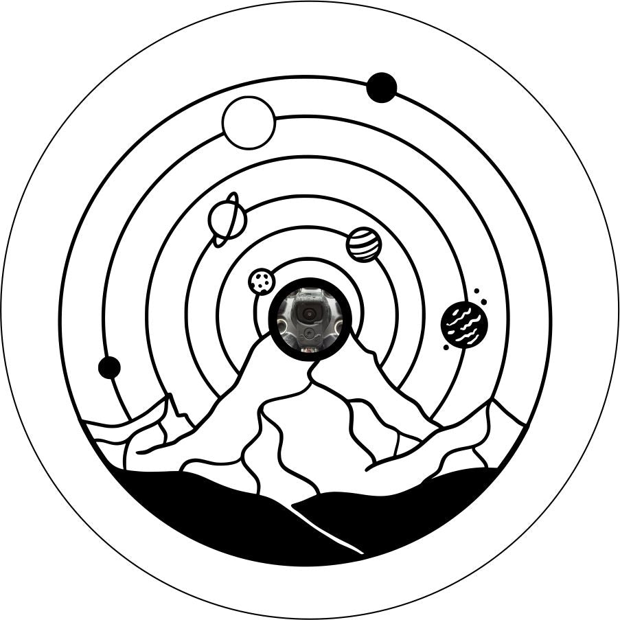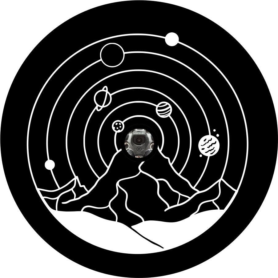 This neat spare tire cover design has a mountain peak in a thin-line design with a display of our solar system, each planet is created as if it shows it in orbit on a line.