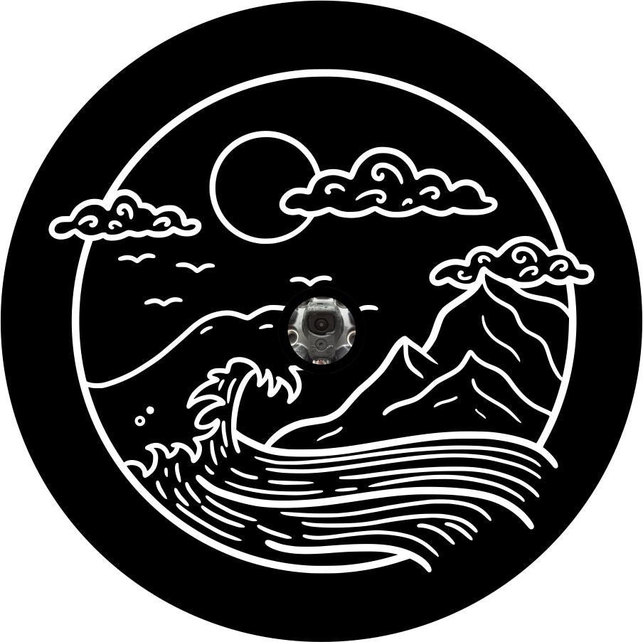 A thin line-drawn design of the ocean waves crashing into the mountains. This spare tire cover design is a beautiful display of all things nature. A great landscape display. This spare tire cover design is a high-quality custom-fit cover for any vehicle, make, model, and size - Jeep, RV, Travel Trailer, Camper, and more!